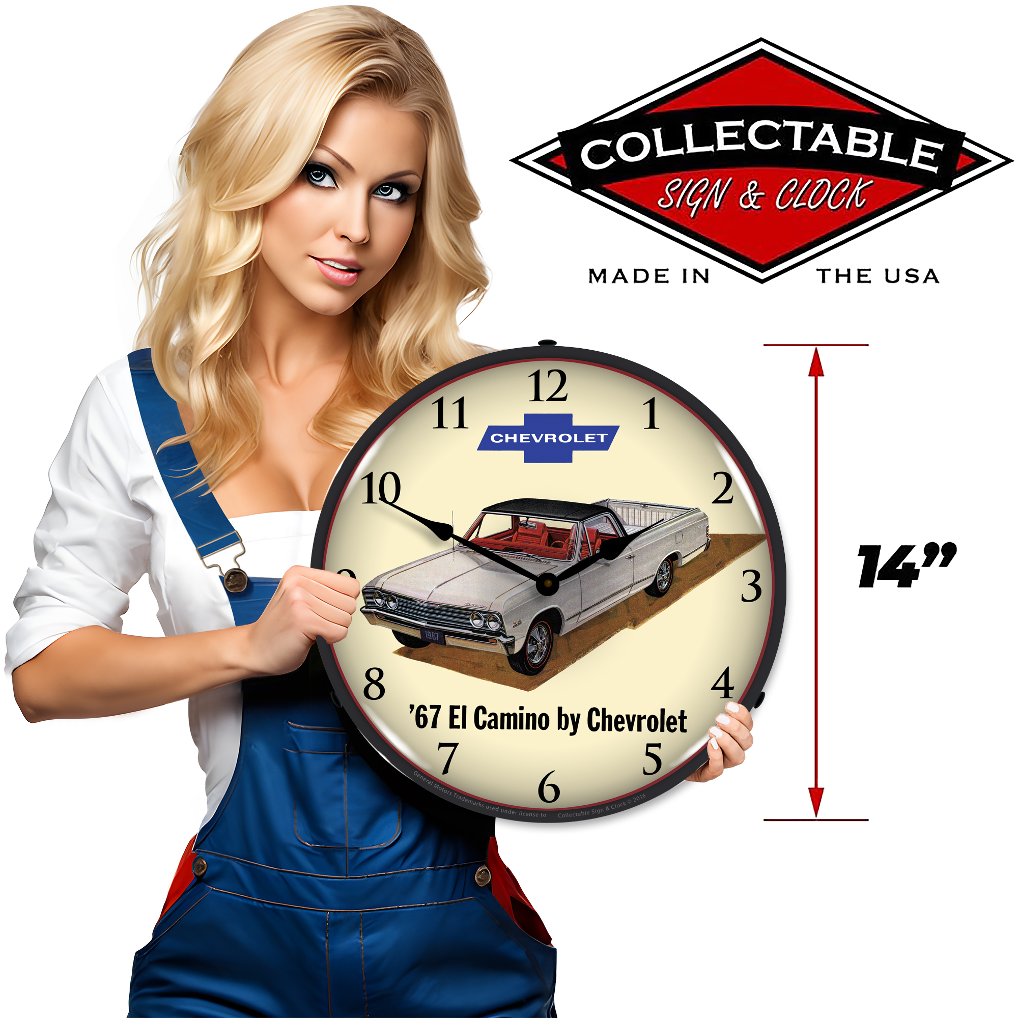 I’ll start from the top. The clock measures 14 inches across. The outer lens is made from high quality optical Lexan held in place with 3 removable rivets. It’s scratch resistant and won’t yellow over time. The advertisement face is cut out by a CNC router and the image is placed with a UV dried computer-controlled printing process that will last for many years. The back of the clock is made from black ABS plastic that houses an LED light source with an on/off switch in the cord. The clock is a battery-operated quartz movement that runs from 1 double AA battery. This sign is awesome when lit! This is a must for any collector and would look great in your home, office, or garage.